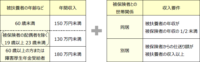 ※「年収の壁・支援強化パッケージ」に基づき、人手不足による労働時間延長等に伴う収入変動により一時的に収入が増加し、130万円(被保険者の配偶者を除く19歳以上23歳未満の方は150万円未満、60歳以上の方または障害厚生年金受給者の場合は180万円)以上となった場合でも、その旨の「事業主の証明」を提出していただくことで認定できるよう条件が緩和されました。